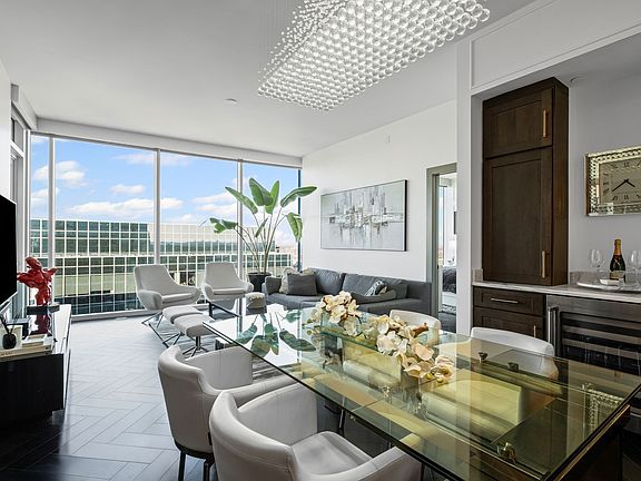 Residents also enjoy exclusive access to the 34th-floor amenity level with a private rooftop pool, state-of-the-art fitness center, sauna, steam room, outdoor living areas with fire features, billiards, and golf simulator, elegant lounge and bar, and private dining and event spaces.