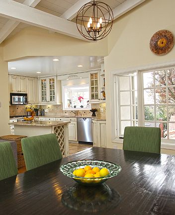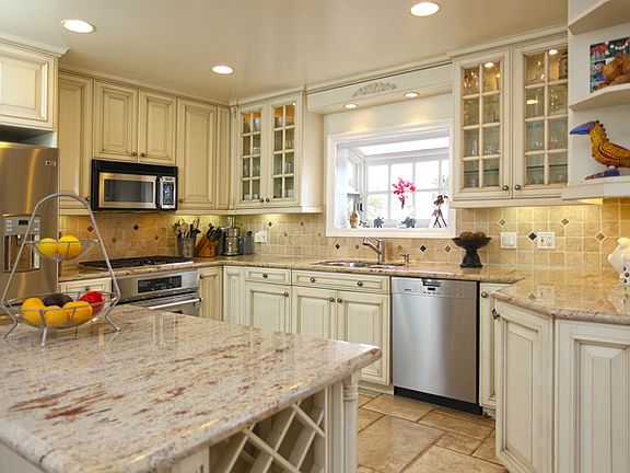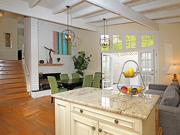 Bright and cheerful split level Traditional set above the Palisades with ocean views from many spaces as well as outdoor areas. Open, free-flowing floor plan, sun-filled, loft-like spaces, two fireplaces, hardwood floors and vaulted beamed ceiling throughout. Kitchen/family room with breakfast area and casual living room each open through French doors to private yard with patios, pool & grassy picnic area with views. Inviting ocean view master with two closets and spacious bath. Two additional bedrooms, one with French doors that opens to a large ocean view terrace. Other amenities include an oversized two-car garage, built-in Lynx bbq, security system and central air conditioning. A charming, warm home on a quiet street in close proximity to the beach and town.
