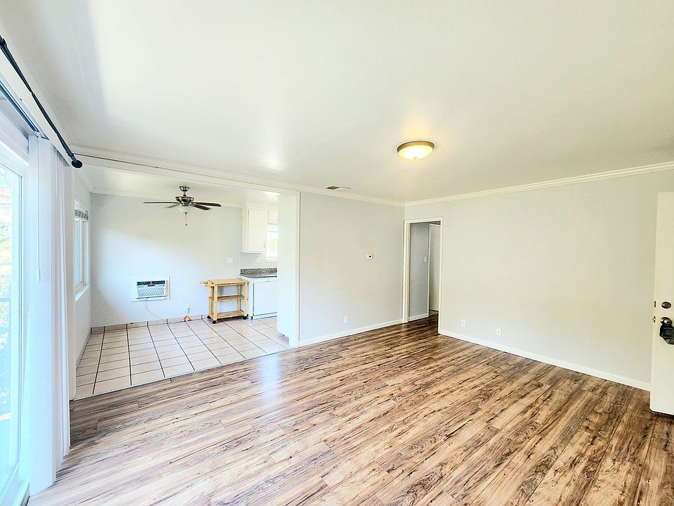 This updated second floor/top floor, 2-bedroom apartment home features a private washer and dryer, AC unit and ceiling fans. Wood laminate floors throughout, an updated bathroom and renovated kitchen counters, kitchen has full appliances. Water and garbage and 1 carport space (two cars are allowed to park tandem in space if cars are smaller) are included with rent along with an external storage closet. One cat allowed, no smoking, 1 year lease.
