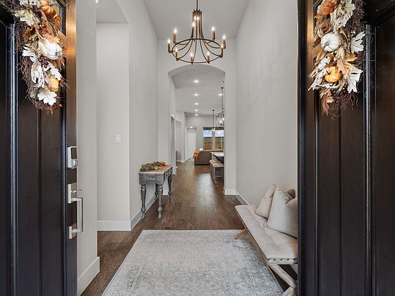 WELCOME HOME to Resort-Style Living in Award-Winning Sandbrock Ranch! This single-story Highland Homes 283 Plan masterpiece blends luxury, comfort, and thoughtful upgrades. Featuring 4 bedrooms, 3 full baths, and a rare 3-car side-by-side garage, it’s designed for both style and function. Inside, you’ll find designer finishes at every turn: 8-ft doors, expansive wood flooring, quartz countertops, a raised stone-hearth fireplace, and remote-controlled shades in the primary suite and living area. A wall of windows showcases your private backyard paradise. Step outside to your Texas-sized covered patio with built-in BBQ, an adjoining fire pit, and a sparkling pool + spa with waterfall, fountain, and sun shelf—perfect for relaxing or entertaining. The gourmet kitchen is a chef’s dream with stainless steel appliances, 5-burner gas cooktop, double ovens, oversized island, built-in microwave, butler’s-style cabinet peninsula, walk-in pantry, plus under-over-cabinet lighting. Unwind in the Owner’s Retreat, featuring a soaking tub, separate shower, dual vanities, and a spacious walk-in closet. For movie nights, the home theater comes fully equipped with a projector and massive screen. Sandbrock Ranch residents enjoy top-tier amenities: the Carriage House Amenity Center with fitness facility, resort pool & splash pad, playgrounds, Scout’s Corner Dog Park, and the whimsical Treehouse Adventure Park. A private K–12 school is nearby for ultimate convenience. Luxury. Comfort. Recreation. This home has it all. Check out our REEL for a closer look!