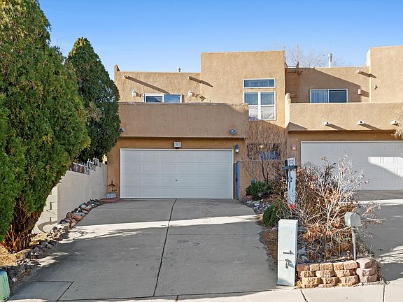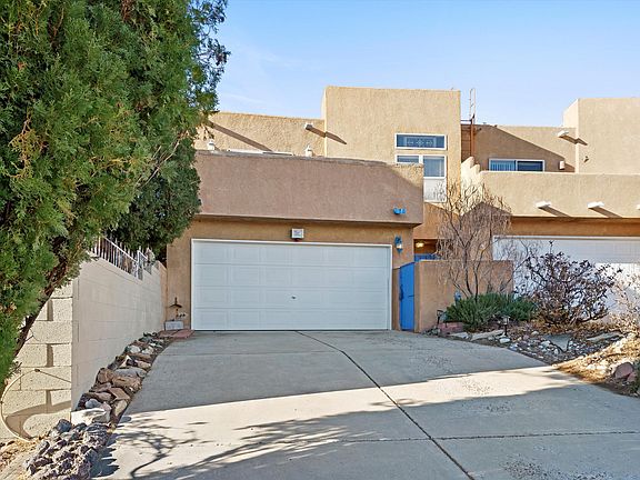 TOWNHOUSE WITH MAJESTIC VIEWS! 2-story, 2-bed perched high with breathtaking views of Rio Grande Valley, city skyline, and Sandias. Elegant bamboo flooring highlighted by dual gas and wood-burning fireplace. Both baths feature ceramic tile, with hall bath boasting solid wood vanity with marble top, complemented by custom tile work around tub. Each room is adorned with high-end and vintage light fixtures. Both bedrooms feature ensuites, ensuring privacy. Inviting kitchen with granite counters and a travertine backsplash, perfect for culinary adventures. Bed and baths are cozily heated with radiant heat. Upgrades include Breezair high-efficiency swamp cooler (i2022), GE over-the-range microwave, smooth top electric range, and GE dishwasher. Get ready to enjoy fabulous views daily--Call now!