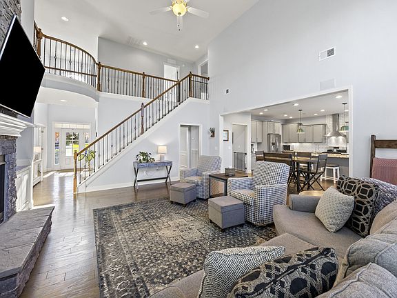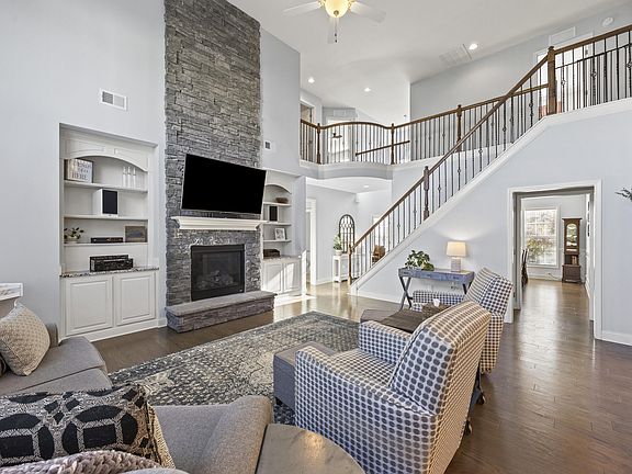 Welcome to this well-appointed two-story home in the desirable Bryant Oak Place neighborhood. This residence showcases a dramatic two-story foyer with a curved balcony overlook. The first floor includes a study with a built-in bar and kegerator, a formal dining room with tray ceiling and wainscoting details, and a convenient guest suite. The spacious family room is highlighted by an impressive two-story bay window, a stone fireplace flanked by built-in bookshelves with granite tops, and surround sound. The kitchen offers an island, walk-in pantry, and separate breakfast area, while the utility room features a built-in folding station and a convenient drop zone nearby. Upstairs, the primary suite offers a generous sitting area and double doors leading to a private bath with dual vanities, two walk-in closets, a garden tub with tile surround, and an oversized tiled shower. Three additional well-sized bedrooms and a full bath with double-sink vanity complete the second floor. Beautifully landscaped, the fully fenced backyard features an extended patio with a fire pit and raised garden beds, perfect for outdoor dining and entertaining.