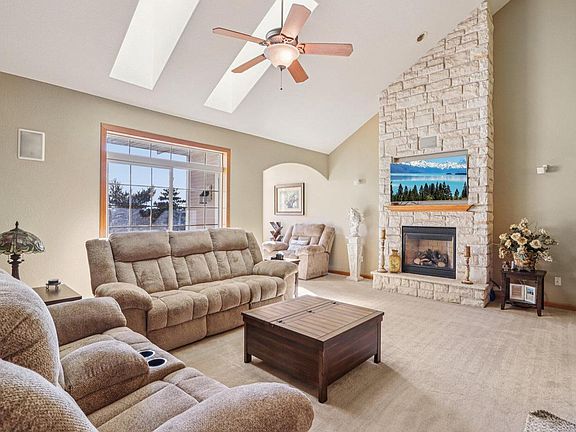 Discover the perfect blend of sophistication, comfort, and warm ambiance in this breathtaking condo. The inviting living room features a dramatic floor-to-ceiling gas fireplace, creating an ideal backdrop for cozy evenings or memorable gatherings. Soft, newer carpeting and fresh paint elevate the sense of luxury, while skylights fill the home with natural light. A spacious loft adds versatility for an office, reading nook, or creative retreat. The beautifully designed kitchen offers a striking slate backsplash and a reverse osmosis water system. Enjoy music with the built-in speaker system and appreciate practical touches like a coated garage floor. Tranquil views and a provided home warranty offer lasting comfort and peace of mind.