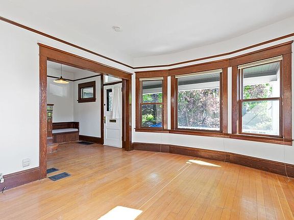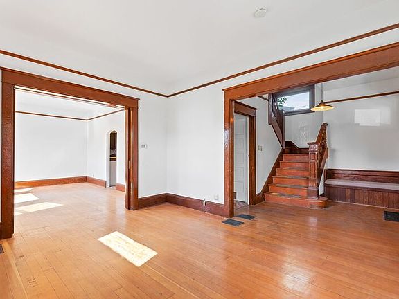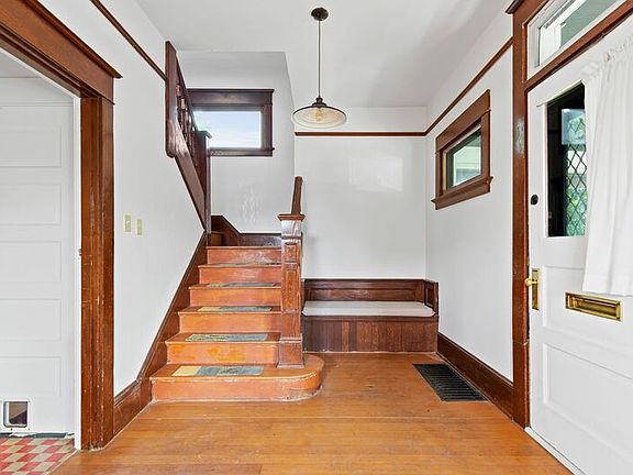 Step into timeless elegance with this beautiful turn-of-the-century, two-story apartment home. A spacious, covered front porch welcomes you into a classic foyer featuring a wooden banister staircase and built-in sitting bench. The light-filled living room showcases original hardwood floors, large windows, and rich wood trim throughout, offering both charm and warmth.