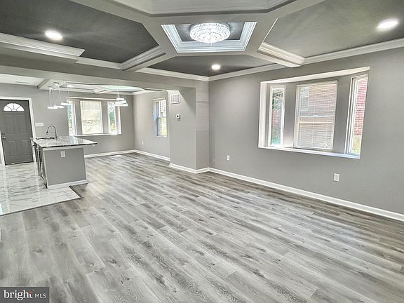 Welcome to this charmingly renovated end unit Baltimore home situated on a spacious lot, known as 1617 Pentwood Road! You are sure to be blown away by the attention to detail paired with the modern elegance radiating from floor to ceiling. You are greeted with an airy open floor plan as you enter the living room, featuring stylishly designed coffered ceilings and a cozy fireplace insert nestled in the custom accent wall. The spacious living room flows seamlessly into the dining area perfect for entertaining or enjoying a meal. The bright dining area opens up to the show stopping gourmet kitchen, which offers an expansive granite island, new stainless steel appliances, and sleek custom cabinets. Off of the kitchen, you can access the rear yard which includes a one car parking pad providing convenient off street parking as well as ample space for creating your own private oasis! Upper level features three carpeted bedrooms with a luxe upgraded bathroom. The fully finished lower level includes a fourth bedroom in addition to a generous open area making the perfect space for a relaxing family room or rec room. Lower level also boasts a contemporary full bath, laundry, and access to the rear yard. Come experience the boundless charm and allure this home has to offer!