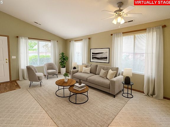 Charming 3-bedroom, 2-bath home with vaulted ceilings and an open floor plan filled with natural light. The spacious living room features a cozy gas fireplace, while the kitchen and dining area flow seamlessly for easy entertaining. Step outside to a beautiful back deck overlooking a private, fenced yard with fruit trees, grapevines, and a garden shed. Primary suite plus two additional bedrooms offer comfort and flexibility. A 2-car garage adds convenience. This inviting home blends indoor comfort with outdoor living in a peaceful setting close proximity to parks, restaurants, shops and freeways.
