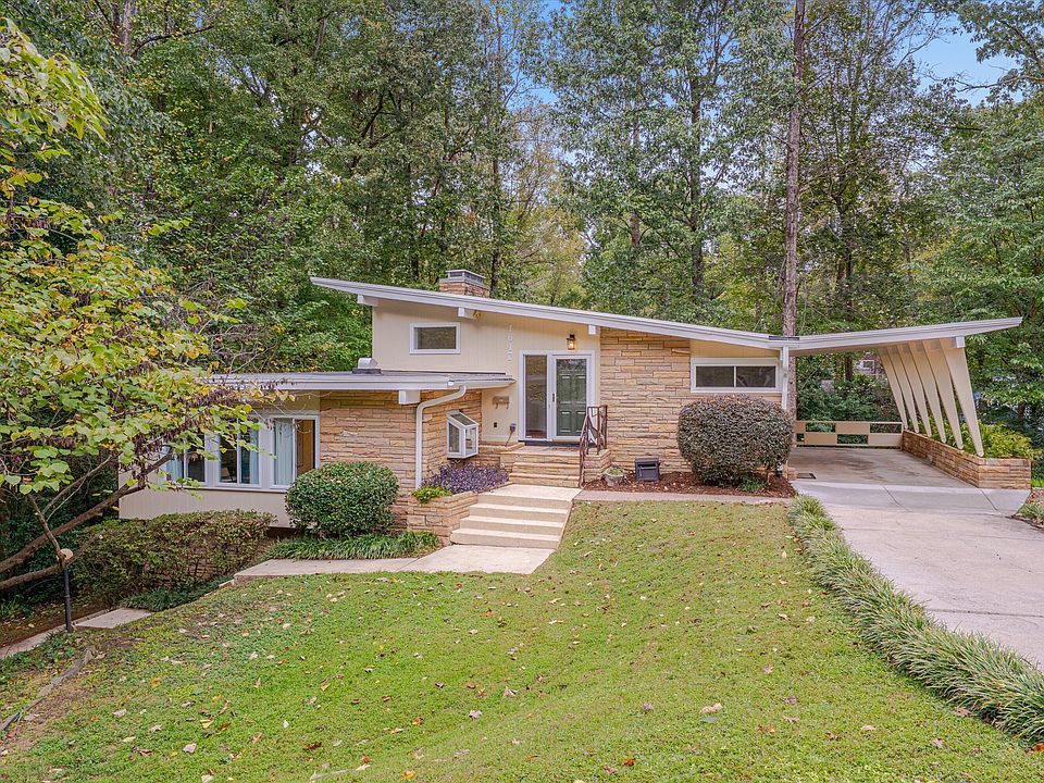 Have you ever wanted to live in a Butterfly House (yes, you are looking at a butterfly roof!) - Your opportunity awaits! 1617 Shawnee is a dreamy, Mid-Century Modern, California-cool abode whose full potential has yet to be realized. This iconic home was created by Durham native, TW Wilkinson in 1957 and has been a show stopper ever since. Own a piece of Durham history (https://www.opendurham.org/buildings/1617-shawnee-street-alfred-henderson-king-house). A nice driveway leading you to the tall carport welcomes you home. Built-in, stone planter boxes are overflowing with beautiful flora. A gorgeous, custom-made metal handrail adorns the front steps - a special thank you to local artist, Andrew Preiss for this one-of-a-kind piece of art! Contemporary shapes and a variety of textures create allure before you even walk in the door. To prepare this home for the market we have given it fresh paint, inside and out. You'll open the deep green, solid wood front door and arrive on original parquet flooring overlooking the three secondary bedrooms and their bathroom on this, the top floor. To your left is a modest set of stairs guiding you to your main living level with solid floors and massive windows - natural light and nature views flood in. Your dining room is sizable and your family room is large. An attractive fireplace takes the stage and a recently painted upper deck gives you the outdoor space you need to grill and entertain. The kitchen has just been refreshed with quartz counters, revived cabinetry, and new stainless steel appliances. You'll notice the warm light streaming in from every direction. Our next floor offers a landing, the main suite, and the laundry/utility room with brand new water heater and a 1/2 bathroom. The main suite in huge! Two satisfactory closets and an improved en suite make this space feel fresh and private. You can exit this floor and pop outside through an unassuming addition and land on the lower deck. The basement floor offers a cozy, hip vibe. A checkerboard linoleum paints the floor where you have your den, second fireplace, large entertaining bar, and potential for a second kitchen-like entertaining space. The same enormous windows make you feel like you are at one with the environment. A tall, black storage unit conveys so that you can house your family games the moment you move in. This floor gives another access to the exterior and the paths that frame this special property. Outside is private and serene. A lovely walkway takes you from the front of your home to the wooded lot that conveys with this one (1609 Shawnee)! Your stroll takes you next to a sweet stream and over a bridge to a secret hideaway! The back yard is lush with established greenery and mature trees. The location is excellent! You are in the quieter section of the coveted Duke Park neighborhood with the larger lots! Across the street is a neighborhood owned 2-3 acre preserve where you can meander among the trees. The Duke Park trails and playground is just a short 8-10 minute stroll away! There is more potential, character, and charm at 1617 Shawnee Street than at any home you have seen in a while. Come, let your imagination run wild and tour this truly fantastic property today!