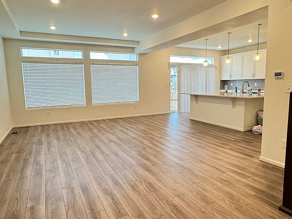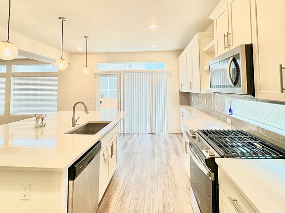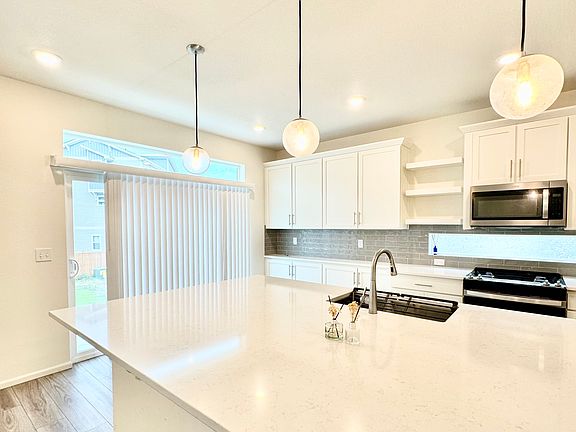 Welcomed by a bright and spacious open-concept floor plan, flooded with natural light. Soaring ceilings, sleek luxury vinyl plank flooring, and crisp contemporary finishes create an immediate sense of grandeur. The gourmet kitchen is a chef's dream, featuring pristine quartz countertops, a large central island, stainless steel appliances, and a full suite of modern cabinetry.