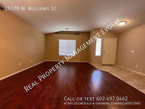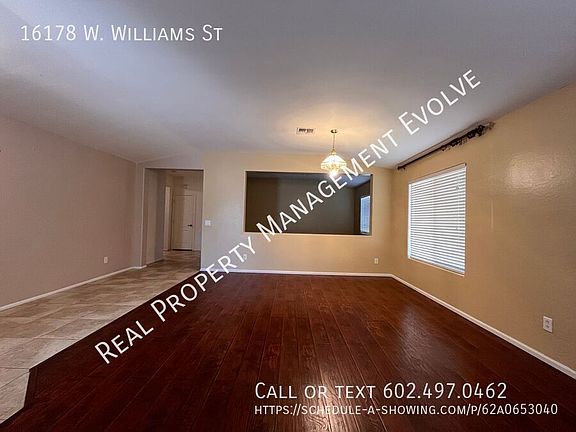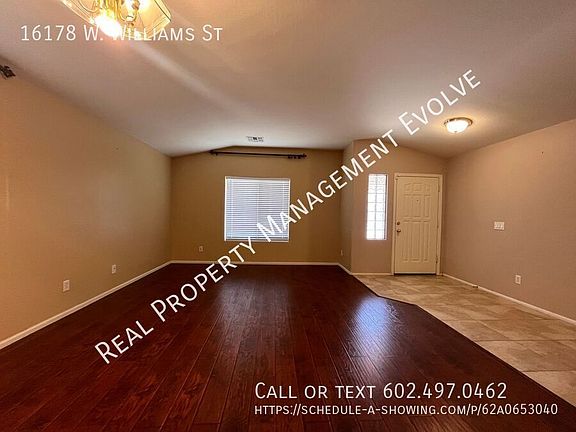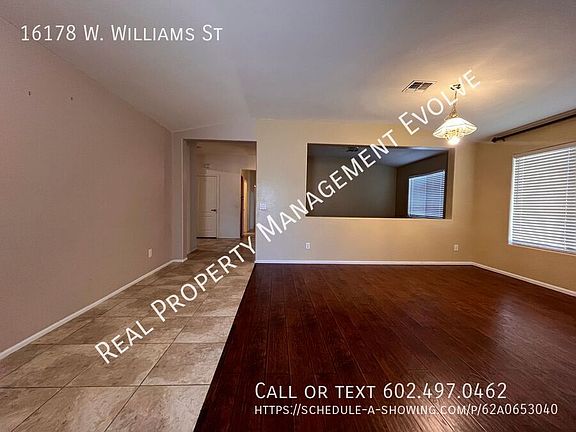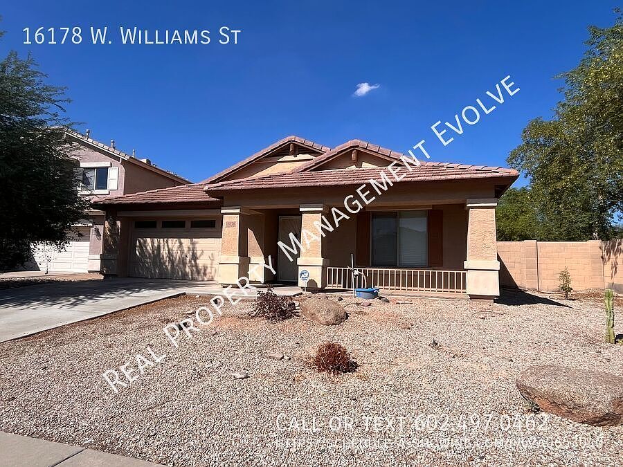 Well-kept 3-bed / 2-bath Goodyear home is move-in ready! Kitchen has lots of honey oak cabinetry, granite counters, island with optional bar seating, pantry, and separate formal dining area. Primary bedroom boasts a walk-in closet with drawers and built-in shelving, and ensuite bathroom offering dual sinks, and separate garden tub and shower. Attached garage and large backyard with covered patio and pavers. Schedule a tour!