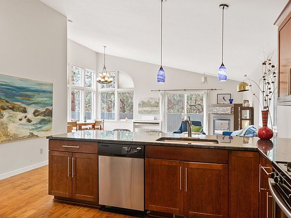 Modern-style home on a quiet westside street. 3 large bedrooms and 3 full baths with updated granite and solid quartz countertops plus an operable skylight with rain sensor in the master bath. Vaulted ceilings with skylights in the open living room/dining area/kitchen. Newer S/S appliances, granite countertops, wood floors, gas fireplace and a solar tube. Large double-paned windows and sliding door open onto a wrap-around deck overlooking mature pines in the backyard that make you feel like you're in a treehouse. Landscaped front yard, fenced patio and irrigated garden area with raspberry bushes and fruit trees. Outside is a separate, artfully finished, studio space with electric heat and lighting. Double garage has workbench, storage unit and a new overhead door. Extra paved parking spaces next to flat driveway. 0.22- acre lot. Close to downtown, walking trails and dog park.