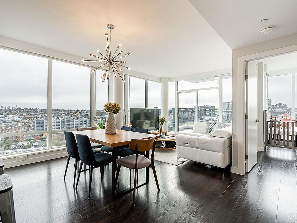 Podium-level corner 2bed/2bath + den unit at Central w/ an abundance of natural light & expansive east & south views, A/C & large patio ideal for entertaining. Unit backs onto rooftop terrace common area, extending your outdoor space. Spacious layout fits full-size dining table, 4 stools at island, large primary (dbl sinks, walk-in shower), 2nd bath newly reno’d. Custom in-suite storage (den). High-end finishings incl. JennAir appls, gas cooktop, wrap-around windows, beautiful flooring. Building offers 7,000 sqft wellness centre: gym, yoga, party/theatre/dining rooms w/ pro kitchen, steam/sauna, rooftop garden. Steps to Olympic Village shops, SkyTrain, & Seawall. 1 pkg, 1 locker, 1 bike locker. Call for your private appointment easy to show!