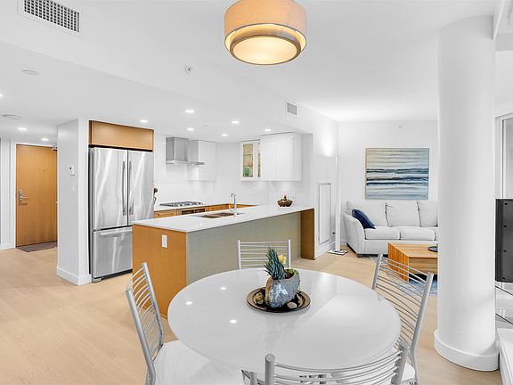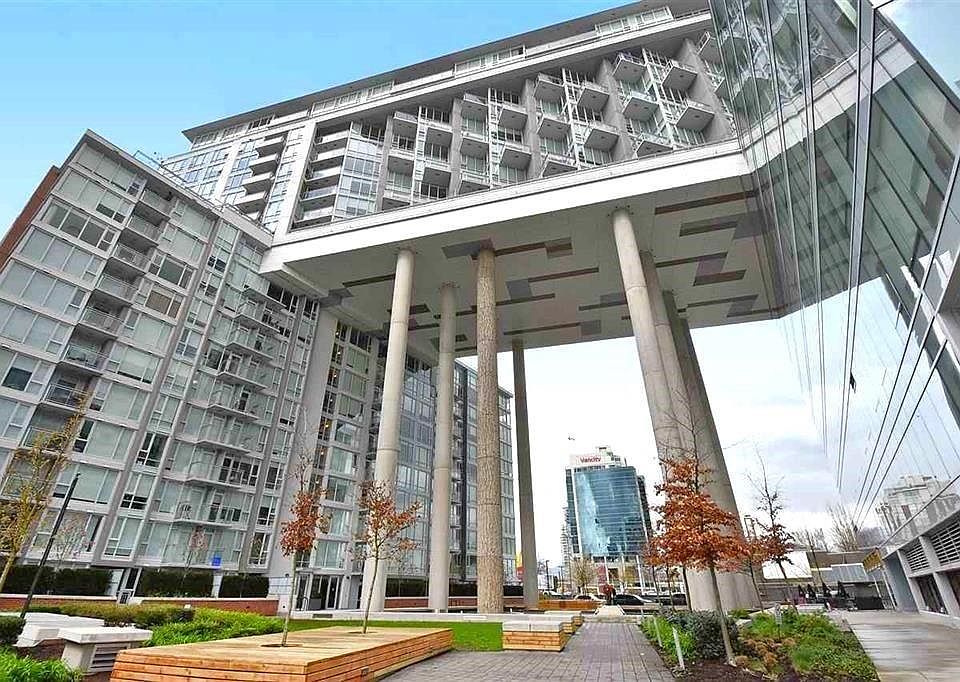 Rarely available 1 Bed + Den at Central! This 703 sq.ft. SE corner Skybridge home captures beautiful natural light and panoramic views from sunrise to afternoon. The open design features a gourmet kitchen with full-size s/s Jenn-Air appliances, custom cabinetry with display lighting, and a welcoming dining area. Upgrades include wide-plank flooring, brand new LED ceiling lights, plus updated bedroom and dining fixtures. The spa-inspired bath offers an enlarged shower with supportive safety bars. The versatile den makes an ideal home office, in-suite storage, pantry extension, or walk-in closet. Relax on the covered patio for morning coffee or alfresco dining. Central offers world-class amenities: concierge, gym, saunas, rooftop patio, lounge & theatre with 1 parking + 1 storage locker