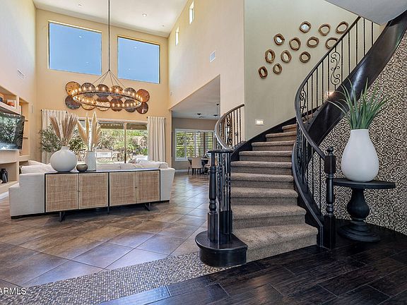 Resort living in the Fireside at Norterra! Voted #1 master planned community by Ranking Arizona. This spacious home has a gorgeous entryway and sweeping staircase. The main level of this Quinlann floorplan by Pulte features an open floor plan with 22ft ceilings, complete with vinyl plank flooring and primary suite! The gourmet kitchen is designed to be the heart of the home, which opens into the great room and dining area. The kitchen is complete with a butlers pantry & serving area, walk-in pantry, executive granite island for casual dining or entertaining a crowd. Off the front tranquil courtyard, you have your own detached private movie theatre/golf simulation room that could serve as a casita. The backyard is truly an oasis with an immaculate design that is complimented well with a water feature & gas fire features. It makes it easy to entertain with the added BBQ area, firepit, and putting green! Well appointed 4600 sq ft home has 5 large beds, dedicated office/den, huge loft, sitting room, library area and golf simulation/theater room with terraced floor. Upgrades include elegant Iron door to private courtyard, newer AC Unit, solar, cozy fireplace, 8 ft interior doors, soft water sys, RO, 3 car garage, epoxy garage floor, ev charging stations, overhead storage racks, RV gate, beautiful pavers at walks and courtyard, built in sound.
