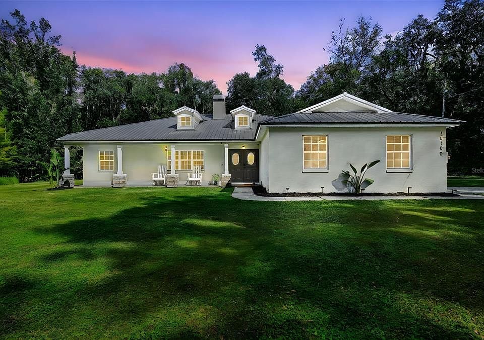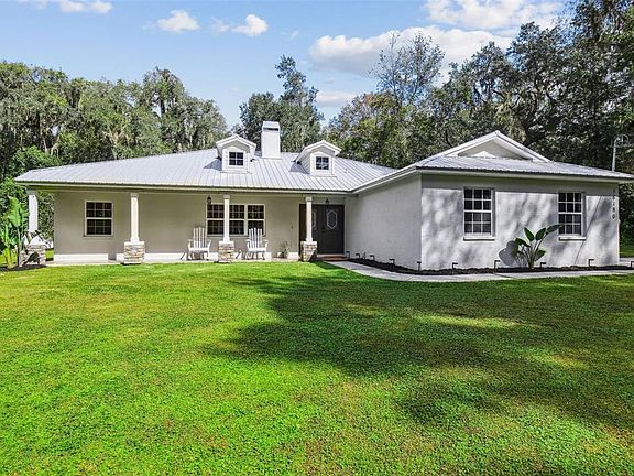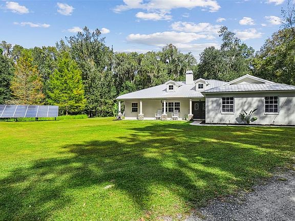 Welcome home to this beautifully updated, one-story retreat set on just over 2 acres of peaceful, private land. Thoughtfully designed with a split floor plan, this residence offers 3 bedrooms, 2 bathrooms, a 2-car garage, and a perfect blend of comfort, charm, and modern upgrades. Step inside to an open, light-filled layout enhanced by brand-new Churchill Oak Deluxe Performance luxury vinyl plank flooring throughout. The inviting great room features vaulted ceilings and a stunning custom stone, wood-burning fireplace, creating a cozy focal point as you enter. The upgraded kitchen is a true highlight, showcasing brand-new dolomite countertops, modern fixtures, and excellent natural light. The spacious eat-in area offers plenty of room for family and friends to gather and enjoy meals together. The generous primary suite provides a peaceful retreat with two walk-in closets and French doors leading directly to the lanai. The additional bedrooms and bathroom are perfectly positioned on the opposite side of the home, offering comfort and privacy for family or guests. A spacious family room on the right wing of the home makes an ideal movie room, playroom, or relaxing second living area. Step outside to your own private oasis. The screened-in lanai overlooks a gorgeous saltwater pool with a tranquil waterfall, creating the perfect backdrop for outdoor living. Nearby, a custom-built gazebo complete with a ceiling fan, sink, stone fireplace and pizza oven provides an incredible space for entertaining year-round. The backyard also features a dedicated fire pit area and a beautiful pond. The owner has thoughtfully improved the land by removing several large pines, opening up the acreage, and creating a serene walking path around the pond. A charming chicken coop sits within the fenced area. Nature lovers will appreciate the abundance of fruit trees, including mature orange, lemon, apple, and lime trees, as well as newly planted banana, elderberry, guava, cherry, mulberry, and fig trees. Additional plantings include herbs, aloe, chaya, katuk, and loofah. Practical features abound, including a two-car garage, an additional two-car carport, and a convenient semi-circle driveway for easy access. The home is equipped with fully paid-off whole-house solar panels (5kW, ground-mounted) that feed back into the grid, delivering exceptional energy efficiency and significantly reduced utility costs. A 50-amp outlet is also installed for a generator hookup, perfect for peace of mind. Recent updates include: New exterior paint (2024),New 50-gallon water heater (2024), Metal roof and solar-powered attic vent fan (2017), Double-pane argon, foam-filled windows (approx. 2018)Septic tank field replaced (approx. 2018) Solar inverter replacement (2023), 4-point inspection passed in 2024, New deluxe luxury vinyl flooring (2025) New dolomite countertops (2025) This exceptional property offers space, privacy, modern convenience, and a lifestyle that feels like home from the moment you arrive. Homes like this on acreage, upgraded, and truly move-in ready are rare. Don’t miss your opportunity to make it yours.