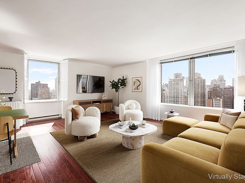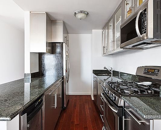 Tenant in place through November 2026. This high-floor, 1,160 SF 2-bedroom, 2-bath condominium (easily convertible to a 3-bedroom) offers open, panoramic views of the East River and city skyline. The spacious living and dining areas are framed by Brazilian cherry hardwood floors, while the renovated kitchen features granite counters, top of the line stainless steel appliances, and a tiled backsplash.