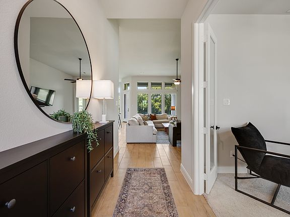 Welcome to this beautifully designed single-story home backing to a lush greenbelt and community walking trail. Thoughtfully crafted with modern style and functional living, this home offers 4 spacious bedrooms, 3 full baths, and a dedicated office with french doors for added office privacy. The open-concept kitchen, living, and dining areas showcase peaceful views of the backyard, with walls of windows dressed in custom shades for both light and privacy. The kitchen features a prep center island, gas cooktop, a huge walk-in pantry and abundant cabinetry, opening into the family room for effortless entertaining. The split-bedroom layout ensures privacy, while the luxurious primary suite includes a spa-like bath with dual vanities, soaking tub, lovely shower, separate linen and walk-in closet. Additional highlights include tile wood look flooring throughout the main living spaces, decorative lighting, a spacious laundry room with folding table, a foot locker, and a 3 car garage. Step outside to a private backyard with covered patio and endless greenbelt views. Residents enjoy access to a resort-style pool with cabanas, playground, sports courts, and scenic walking trails.
