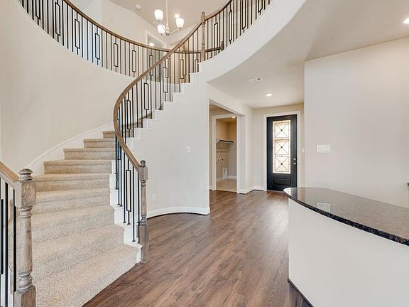 The open-concept family room features wood floors, a dry bar, and a sleek linear fireplace. The gourmet kitchen is equipped with a large island, granite slab countertops, white Shaker cabinets, pots and pans drawers, a full bowl sink, stainless steel appliances, a 5-burner gas cooktop, and a convenient trash can drawer. Formal Living Room, Home Office or Den. Custom features include wood floors, 8 foot doors, & flat screen tv wiring. The primary bath features a freestanding tub, a glass shower with tile, double rectangular sinks, and a walk-in closet. Downstairs Guest Suite. Upstairs Gameroom, Media Room or could be a Children's Retreat. Covered Back Patio.