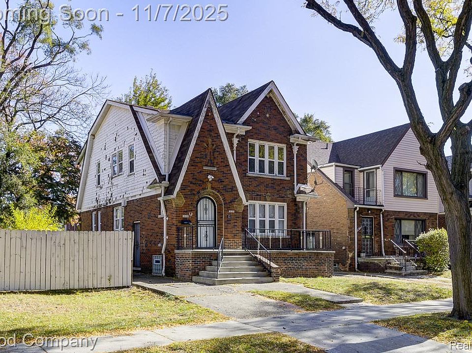 Contact LISTING AGENT to schedule a tour. Wonderful two unit multifamily Tudor home in Detroit with a spacious layout, striking curb appeal, and loads of original character throughout. This charming brick beauty offers matching upper and lower units, each with hardwood floors, arched entryways, and oversized windows that fill the space with natural light. The bright living rooms feature cozy fireplaces and flow seamlessly into elegant formal dining rooms. Each unit has two bedrooms and a full bath, with the first-floor unit offering a flexible bonus space perfect for a home office or walk-in closet. The upstairs unit adds a private balcony overlooking a tree-filled backyard. Both kitchens are generously sized with tile flooring and plenty of cabinet space. A full shared basement offers tons of room for storage or potential finishing. Nestled on a quiet block with mature trees, this home blends classic charm with rental opportunity or multi-generational living. Welcome Home!