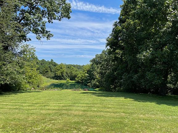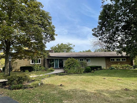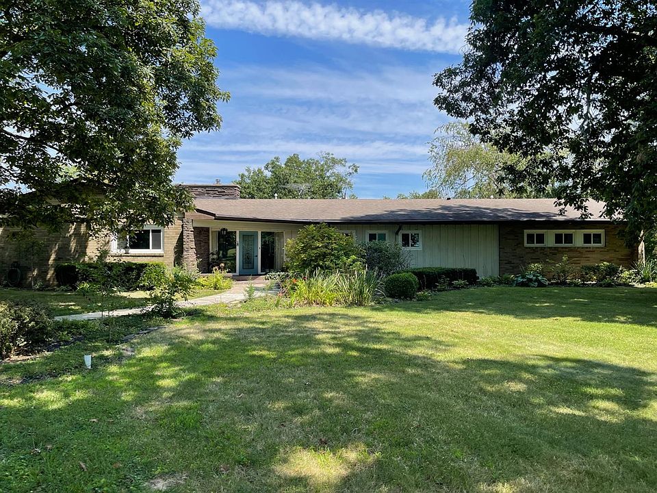 Brick & Frame one of a kind ranch w/large overhangs in the Frank Lloyd Wright style on picturesque 4.55 acres. LR w/wall of glass overlooks pond and park-like grounds. New gas forced air heat, all new flooring throughout, updated kitchen & baths, 3 fireplaces, large raised patio, walk-out lower level, so much more! Newer 40x46 detached garage.