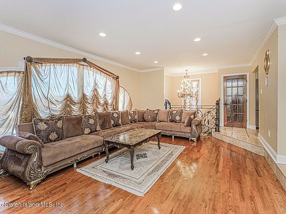 Step inside to find a sunken living room enhanced by elegant custom drapery,