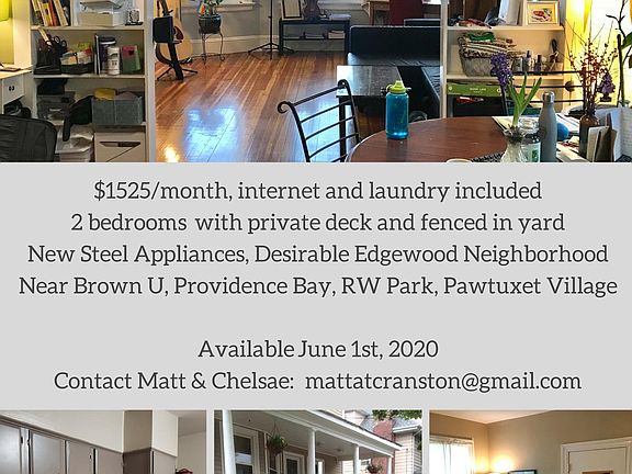 AVAILABLE June 1... $1525/month Desirable Edgewood Neighborhood New Stainless Steel Appliances, updated kitchen Laundry included (New Appliances) Internet included 2 bedroom/1 bath with private deck Off Street Parking Double parlor with built-ins 9 Minutes to Brown University Campus 3 blocks from historic Roger Williams Park, Narragansett Bay 5 minutes to highway access and downtown Free Internet and Laundry! Tenant pays heat and electric. Dogs negotiable (under 30lbs).