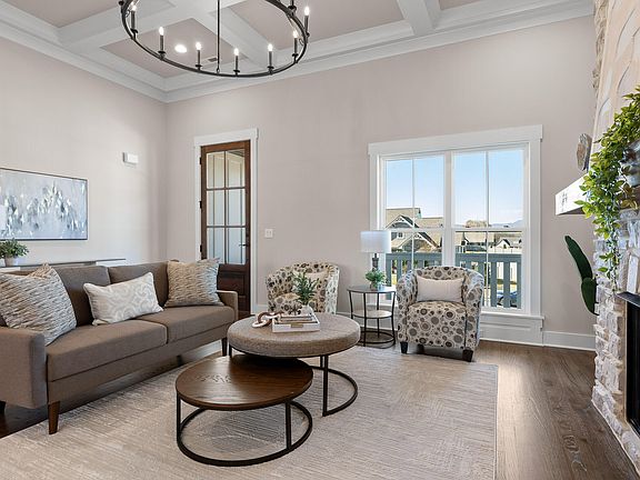 Partially brick homeStone gas fireplaceMountain viewsMain-level primary suiteCustom built-insCovered front porchDining area