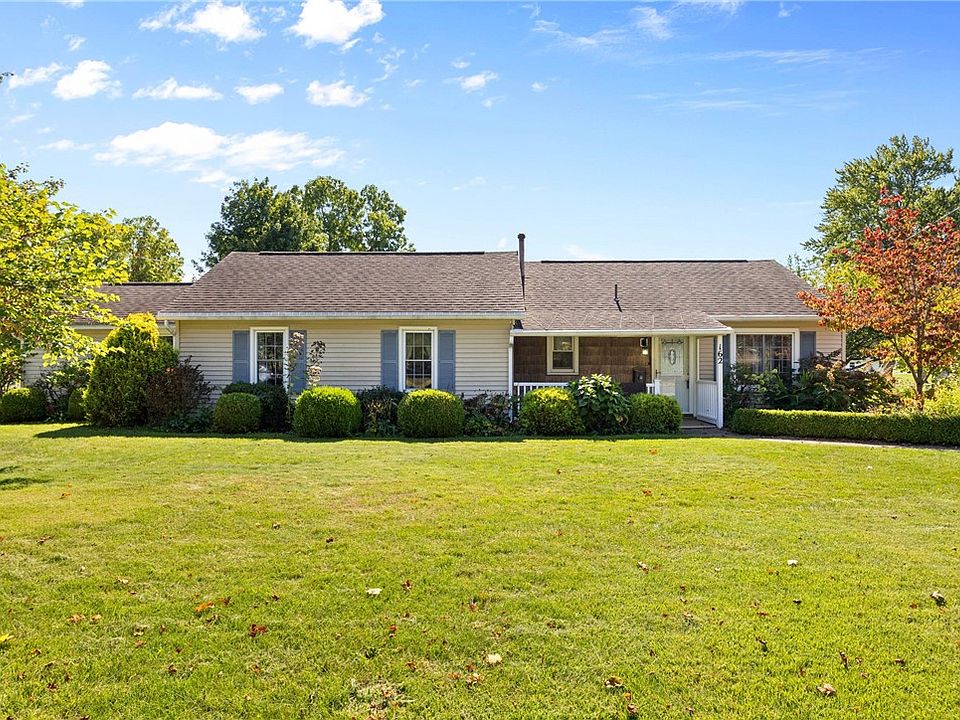Quintessential village ranch on a quiet street surrounded by mature perennials that bloom in stages throughout the growing season. Everything is all on one floor, making the flow of this home comfortable for daily living with spaces for those times when you need more. The generously sized kitchen looks onto a bump-out which can be used for full-sized dining or porch-like seating - look further onto the patio and garden. Retract the awning for full advantage of south-facing sunlight in the winter - and fully extend it for sun protection in summer months. At a nicely sized 1,624 square feet of one-floor living area, it is complemented by another 645 square feet of garage space with a workbench and parking for two cars - so there is room for all the things you are bringing with you.