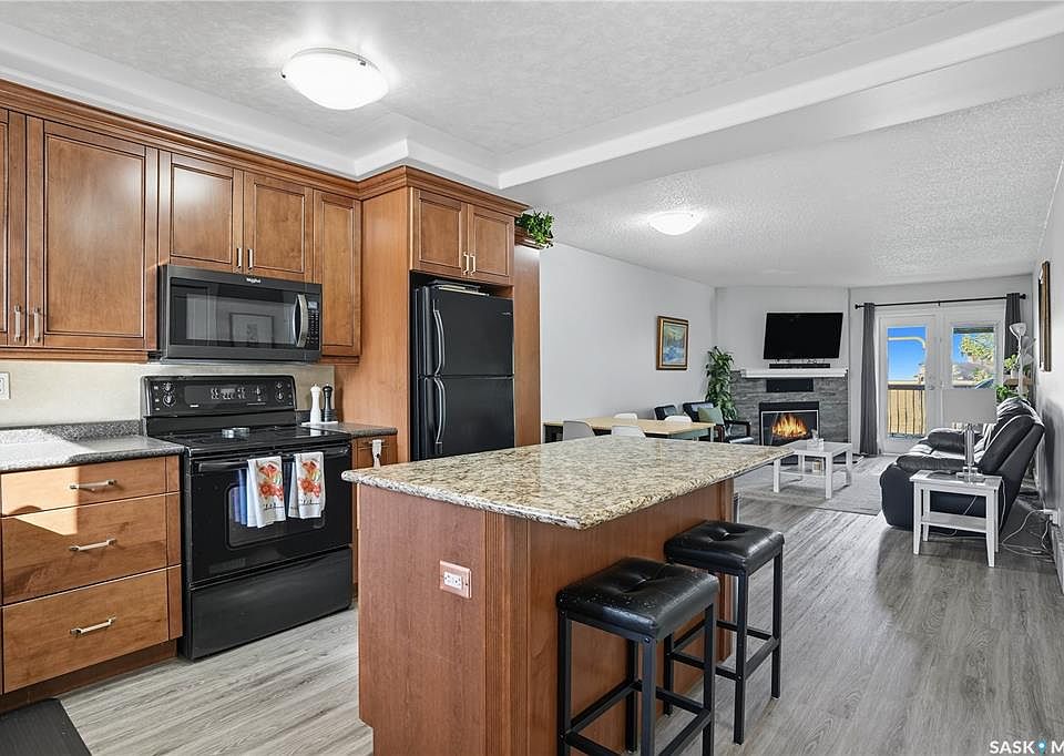 Welcome to this beautifully updated and move-in ready two-bedroom, one-bathroom upper-level condo in Cedar Meadow — a true hidden gem! Perfectly located within walking distance to schools, parks, walking paths, and all the amenities you need, this home combines convenience with comfort. Step inside and be greeted by a spacious, open-concept layout designed for both everyday living and entertaining. The stunning kitchen is a standout feature, boasting stone countertops, soft-close cabinetry, a central island perfect for meal prep, and an abundance of storage, including a built-in dining room cabinet. The kitchen is equipped with modern appliances — fridge, stove, built-in dishwasher, built-in microwave — plus a designated space for a wine fridge. The dining room flows seamlessly into the inviting living room, where a charming decorative fireplace adds warmth and character. From here, large windows and a sliding door lead to your private balcony with peaceful views of the green space and play structure — the perfect spot to relax with your morning coffee or unwind at the end of the day. Both bedrooms are generously sized, with the primary offering the bonus of double closets for ample storage. The unit also includes the convenience of in-suite laundry. An additional highlight is the maintenance-free furnace and air conditioner, both owned and serviced by the condo association, giving you peace of mind year-round. Enjoy one electrified parking stall included with the condo, plus additional storage off the deck. Need more parking? A second stall can be rented seasonally at an affordable rate. This rare Cedar Meadow condo truly has it all — a functional floor plan, stylish updates, and a welcoming community in an unbeatable location. Don’t miss your opportunity to call this one-of-a-kind property home!