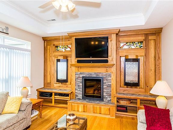 One level living with stunning decor. Numerous upgrades! Concrete private patio with retractable Sunesta awning, southern rock paver fire pit and Char Broil gas grill. Beautiful 12x9 sun room off master bedroom. Custom stained glass throughout. Functional two tier kitchen island and beautiful maple cabinetry. Tray ceilings and custom solid oak wall in living area with built ins enhanced by Napoleon electric fireplace with adjustable flame. Detached patio style home. Located in The Courtyards of Cobblestone, this community is an ideal location for airport, 79 and 279. It features beautiful private pool and clubhouse.