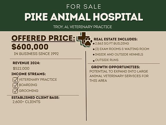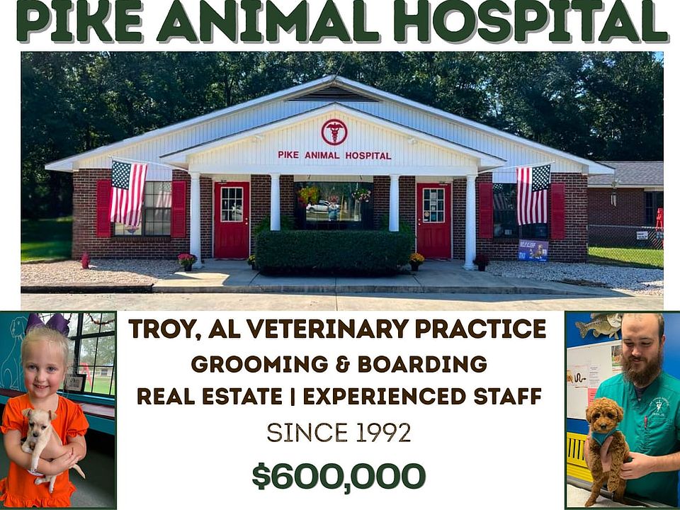 Veterinary practice in Troy, Alabama, in operation for 33 years, includes boarding and grooming services, along with the associated real estate. Wonderful, experienced staff in place and is now offered for sale by the family of Dr. Lawrence Johnston.