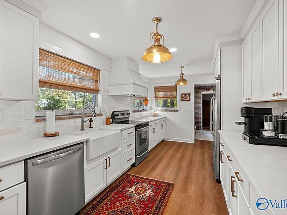 Stone fireplacePrivate patioCozy fireplaceExposed beamsLarge single sink bowlOversized windowsStainless appliances