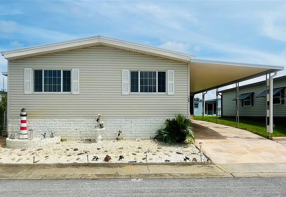Spacious and unique 3 bedroom/2 bath double wide manufactured home. This large home offers 1464 living area square footage and sought after split floor plan offering both space and privacy. Step inside to an open and airy layout that includes the primary suite on one side and the guest bedrooms on the other. Large eat in kitchen, dining room, and a welcoming living room with vaulted ceilings and a fireplace. Laundry located inside the home. Enjoy indoor-outdoor living with a screened side porch, covered 2 car covered driveway, and maintained landscaping. This move in ready home is located in Blue Jay Estates, an active 55+ community where you own your land! It is situated in a non-flood zone and there is no lot rent! A low monthly fee of $230 a month includes escrow reserves, water, sewer, trash, lawn care, and more! Schedule your showing today. Blue Jay has a very active social club, lots of activities, a heated pool for year-round enjoyment, shuffleboard and Bocce courts. There is a designated area where you can park your boat or R/V at no additional fee if space is available when requested. Near beaches, the Pinellas trail, parks, shopping, medical centers, and airports