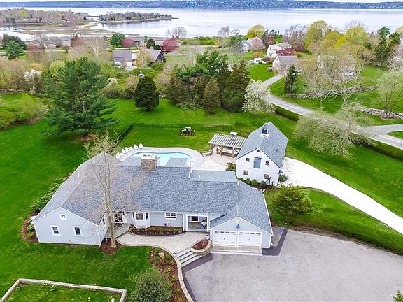 Completely & impeccably renovated in 2018, this stunning Cape style home within desirable Winnisimet Farms offers elegant interior living & sumptuous outdoor living centered on the gunite pool & spacious decks and also benefits from deeded beach access & mooring rights. New custom gourmet kitchen features a marble-tiled backsplash, Chef's grade Bertazzoni stove & gas fireplace. Sun drenched west facing living room enjoys a cathedral ceiling, wood burning fireplace, large windows & glass doors running the length of 52' deck overlooking the pool and offering some water views of the Sakonnet. The roomy & bright walkout lower level has a full kitchen, full bath & bonus room which is ideal for a gym or in-law suite. Within the main house, there is 4097 sq ft of living area including 3 bedrooms on the 1st floor, walkout lower level & a sleeping loft with office area. Within the 24' X 36' barn, there is an additional 1500 sq ft of summer living area. Ideal for entertaining, the barn features a significant great room with a wet bar, 2 refrigerators on the 1st level & 2 sleeping areas & a full bathroom on the upper level. The extensive and stunning hardscaping includes slate fieldstone walls, large patio, loggia, pergola & a gorgeous outdoor fireplace. Sited on a 1.7 acre corner lot & clamshell path driveway. This lovely neighborhood offers a tranquil coastal New England setting in the magical Farm Coast area yet is only minutes to highway access. FLOOR PLANS & DISCLOSURES ATTACHED