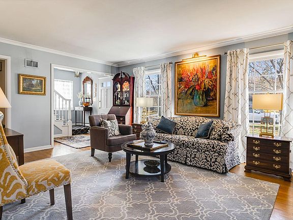 This beautifully updated Ravenswood Colonial blends timeless character with modern comfort. Stunning Design Group Three remodeled kitchen & hardwood floors. Elegant living room centers around a fireplace & the dining room offers the perfect setting for gatherings. The bright, modern kitchen showcases quartz countertops, a subway tile backsplash, custom white cabinetry & SS appliances. A sunny dinette opens to the cedar-beamed family room with access to the deck--ideal for indoor-outdoor living. The spacious primary suite offers north, south, and east views, four large east-facing windows, double closets & private sun deck. Additional BRs have walk-in closets. Cozy office for work or reading. New furnace and A/C (2025), 2 car GA (2022). Private, tree-lined backyard creates a serene retreat.