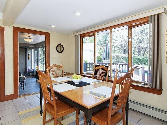 A private oasis in a neighborhood of fine homes. This creatively expanded and smartly updated 4 bedroom Colonial sits on a .74 acre landscaped corner lot. Its flexible, sunny living spaces are perfect for entertaining! Enjoy gatherings in the formal dining room, over-sized eat-in kitchen, cozy den and family room with kitchen and deck. The sunroom entry overlooks an amazing patio, gardens, walkways, deck and heated pool. Main floor bedroom and full bath, office with 1/2 bath, and laundry. Three bedrooms upstairs. One is tandem--convert to a private space, or use as a Master sitting area or exercise room. Cheerful corner bedroom with treetop views of the grounds and panoramic sunsets. Master bath has a steam shower, third full bath has a dressing area. Two 2-car garages. Updates: gas fireplace, Buderus boiler, AC, windows, wood floors, generator and more! Easy access to highly rated Chelmsford schools, recreation, shopping and commuting routes 3, 4 and 495. In-law or au pair potential.
