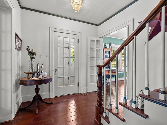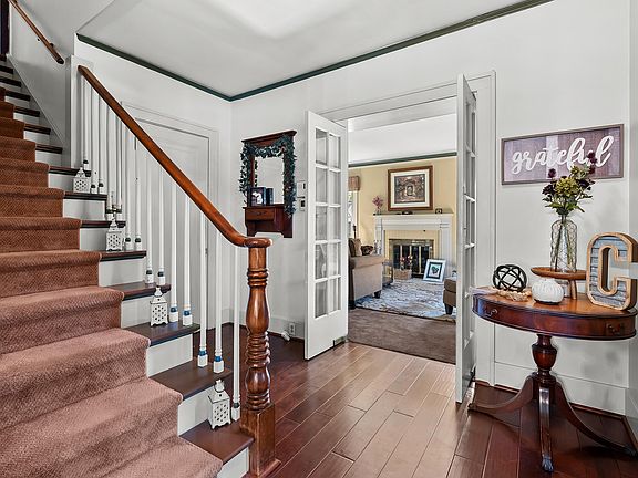 This gorgeous and spacious 4-bed, 3-bath home is located in a desirable neighborhood, conveniently close to a hospital, shopping, dining, and other amenities. Situated on a beautifully landscaped 0.275-acre corner lot, this home welcomes you with a hallway featuring hardwood floors and a stylish stairway. Hardwood floors extend into the formal dining area and a large kitchen with ample counter space and access to the back patio. The main level also includes a full bath, a large living room with a fireplace, and sliders leading to a sunroom. Upstairs, you'll find a good-sized primary bedroom, three additional bedrooms, another full bath, and attic access for extra storage. The finished basement boasts a large rec room with a wet bar, a craft room, a laundry room, a half bath, and a storage room. Outside, enjoy a 2-car detached garage, a large patio perfect for entertaining, a beautifully landscaped backyard with a storage shed, and a fire pit. Peace and tranquility while still in town.