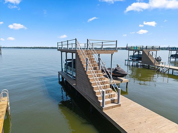 The property includes a well-appointed boathouse with a lift for a tri-toon boat, two jet ski lifts, a storage closet, and an irrigation system sourced directly from the lake.