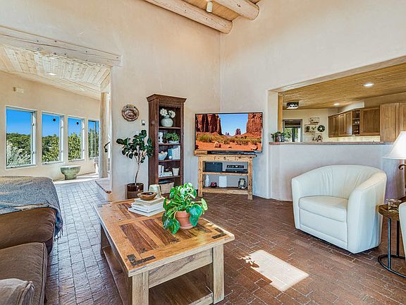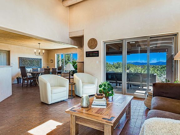 Beautifully designed by Paula Baker in the late 90's, positioned on a 10.9 acre lot to capture great mountain views from every room with abundant indoor/outdoor features. This 3BR/2BA home also has a private access office with half bath, perfect for an in-home occupation or guest quarters. The upstairs master includes a library room and a lovely outdoor deck with long range Sangre de Cristo views. A number of improvements have been made since 2016 including a kitchen remodel with new appliances, countertops and sinks. An extensive solar installation by Select Solar LLC was recently activated. A new single ply Bitumen roof was just completed. Most impressive is the addition in 2017 of an 820sf detached studio, a stunning work space. Designed for the music professional, but equally suitable for any artist, dancer, therapist or teacher. How about a home gym? A must see property, located only one mile from the Eaves movie ranch and just a 15 minute drive to Santa Fe.