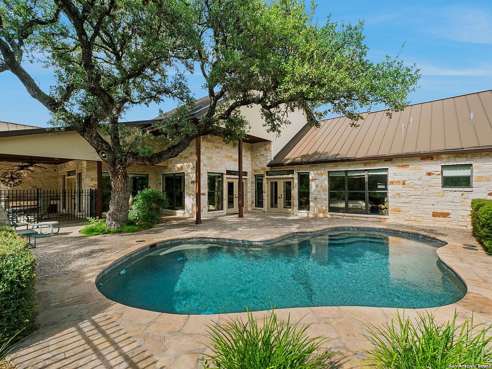 Perfectly situated across from the private Swede Creek Park in the prestigious, guard-gated community of Cordillera Ranch, this immaculate one-story home built by Stadler Custom Homes offers 4,826 sqft of thoughtfully designed living space on a 2.77-acre lot with mature trees and serene Hill Country views. Inside, you'll find 5 spacious bedrooms and 4.5 bathrooms, including two primary suites with en-suite baths-ideal for multigenerational living or guests-plus an additional secondary bedroom with its own en-suite. A private study, formal dining room, two living areas, and a versatile flex room provide space for every lifestyle. The oversized chef's kitchen is the heart of the home, boasting a large island with built-in ice maker, walk-in pantry, breakfast area, and extended bar seating perfect for entertaining. Solid-core doors, custom oak flooring, and beautiful finishes reflect the quality of this original-owner home. A large interior storage room with direct access to the 3-car garage and a fully floored attic with permanent stairs offers incredible bonus storage. Step outside to your gated backyard retreat featuring a sparkling swimming pool, spacious covered patio with built-in grill and counter space, and plenty of room to enjoy peaceful outdoor living. Enjoy the unmatched lifestyle of Cordillera Ranch with over 7 miles of nature trails and optional membership to the exclusive Clubs of Cordillera Ranch-including golf, spa, tennis/pickleball, fitness, equestrian center, gun club, and river club. Just 15 minutes from downtown Boerne and 20 minutes to San Antonio, 162 Riverwood offers luxury, privacy, and community-an extraordinary retreat to enjoy Hill Country living.