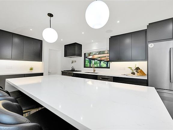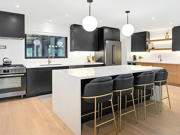 Oversized waterfall islandHigh-end bosch appliancesQuartz countersFull-height quartz backsplashUnder-cabinet lightingOversized windowsSpa-inspired ensuite