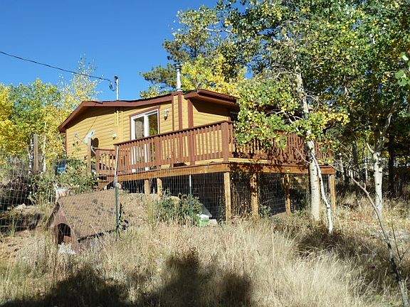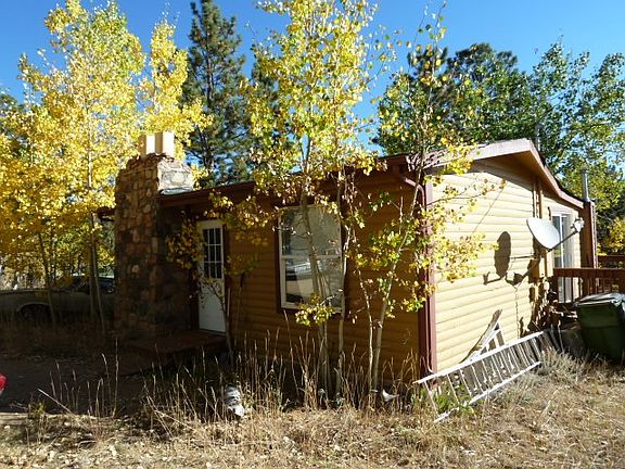 Cute little bungalow with a stone fireplace among a Pine & Aspen grove, surrounded by beautiful mountains. This 2 bed 1 bath, 675 sq ft home is situated on .40 acres of flat land. Updated interior with stained wooden trim throughout which compliments the wood ceiling beam in the living room. All new light fixtures, oak cabinets, stainless steel sink, matching black appliances, tile counter tops, large fenced area out back, front porch and back deck. It is well-kept and move in ready. Easy access to US 285.