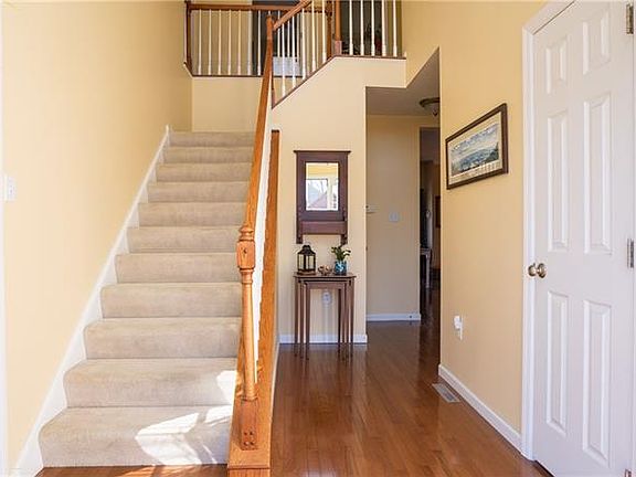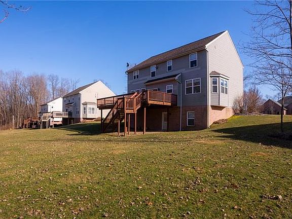 Meticulous 10 year old home with beautiful curb appeal at the end of a quiet cul-de-sac with wooded backyard. Move right in to this 4 BD, 2.5 BA home with coastal colors, gleaming hardwood floors and 10 ft ceilings throughout. 2 story foyer with palladium window and coat closet & half bath creates a welcoming entrance. An office or formal LR to the left with French doors. The eat-in kitchen has great counter space with a center island and opens to the cozy family room with gas FP & plantation shutters. Spacious master suite upstairs with two walk in closets, and lg bath with walk in shower and soaking tub. Laundry room is on the upper level along with 3 more generous bedrooms & full bath. The walk out basement is plumbed for a bathroom & is ready to be finished! Huge deck off the kitchen area overlooks the trees in the back with level yard space. Concrete driveway with 2 car attached garage, nicely landscaped yard, short jaunt to SRU and 10 min from I-79!