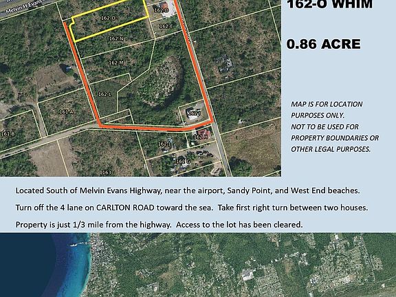 Nice large lot offers privacy with easy access to the highway. Great flat lot is large enough and zoned to build two homes. Access from the road has been cleared. This is a great location just across the highway from Carlton Estate, only minutes from Sandy Point, beautiful West End beaches and the airport.