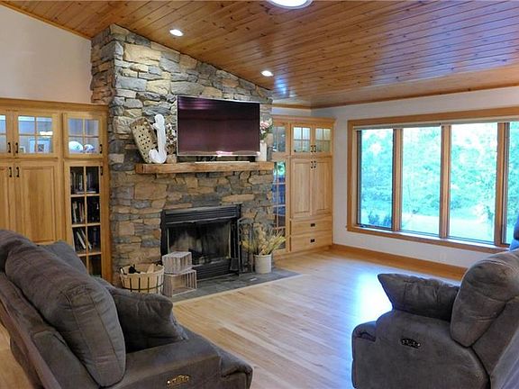 Beautiful high quality custom built home sitting on two lots at the end of a dead end road between Rice Lake and Cameron. This home has an open floor plan with vaulted wood ceiling in the living room, dining room, and kitchen. There is a large laundry room off the kitchen as well as a half bath.The massive stone woodburning fireplace in the living room has custom hickory built-ins on both sides. The basement has in-floor heat and a large egress window for a possible 4th bedroom in the future if desired. The kitchen and both full baths on the main floor have been updated with granite countertops. Enjoy the large covered deck and large rear deck that overlooks the private backyard. The siding and roof have also been recently replaced and the attached garage is heated.