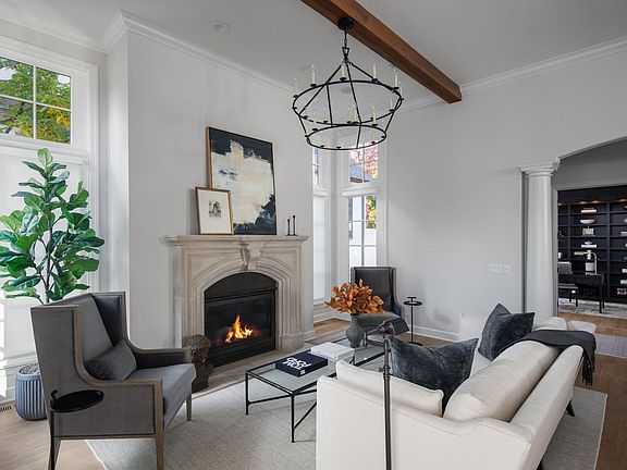 Every element has been thoughtfully curated, from the designer lighting and striking wood beams in the formal living and dining areas to the inviting family room off the kitchen—each anchored by an elegant gas fireplace.