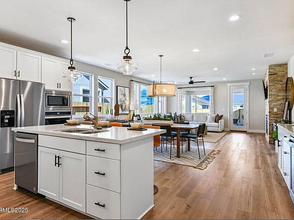 Stunning New Construction in The Villages at Monte Vista - Plan 1 Nestled in one of the most desirable areas for outdoor enthusiasts and nature lovers, this gorgeous, brand-new single-story home in The Villages at Monte Vista offers the perfect blend of comfort, style, and convenience. Located just minutes from downtown, parks, scenic trails, and shopping, this home puts everything you need right at your fingertips. Boasting 2,045 sq. ft. of thoughtfully designed living space, this home features 3 spacious bedrooms, an office, and 2 full baths. The oversized 2-car garage provides ample room for both your vehicles and a coveted workbench area. No detail has been overlooked, with luxurious upgrades throughout that elevate the home's design and functionality. The heart of the home showcases a striking fireplace with stacked stone extending from floor to ceiling, setting the tone for the open, airy living space. The chef-inspired kitchen offers white cabinetry with soft-close hardware, sleek quartz countertops with soft veining that seamlessly extends to the full backsplash and upgraded appliances for a truly modern feel. A unique dry bar area, complete with upper cabinets, beautiful open shelving, and a wine fridge, makes for an ideal spot to entertain or unwind. Throughout the main living areas—and in the primary bedroom—LVP flooring enhances both style and durability, while a bonus electrical upgrade package adds convenience with cabinet lighting, wired for 60amp EV charger, and a dedicated exterior Christmas light package with outlets at the eaves and a switch for easy control. The upgraded plumbing package includes sleek undermount rectangular sinks in the bathrooms, comfort-height toilets, and a luxurious 6' soaking tub in the primary bath. Step outside to enjoy the serene mountain views from the covered black patio and take advantage of the generous 8,360 sq. ft. lot—offering plenty of space to create your personal outdoor retreat. This home is a true must-see, offering both refined design and modern conveniences in an exceptional location! Some photos are model home, but same Floor Plan 1.