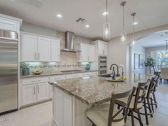 This elegant Nice floorplan home showcases impressive curb appeal upon arrival, with low-maintenance faux grass and palm trees, travertine decking, and a paver driveway. Step inside to discover tile flooring throughout, the gourmet kitchen package, updated cabinets, newer interior/exterior paint, new countertops in the primary bathroom, and a custom closet organizing system. A spacious formal dining area and a great room effortlessly connects indoor and outdoor living with its built-in surround sound & two rolling walls of glass to the covered patio, with its cozy gas fireplace. This backyard oasis is complete with a built-in BBQ, bar top table, two fire features, lush landscaping, faux grass, all on an oversized lot. Don't miss this one! Arizona living is Right Here Waiting for you