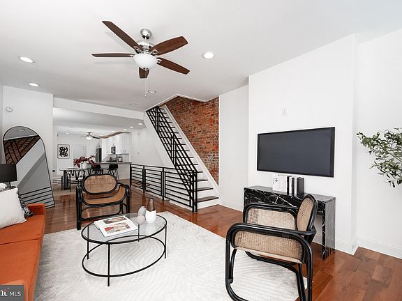 TAX ABATEMENT UNTIL 12/31/2028! This oversized two story townhome in Brewerytown is a gracious 15' wide and features high ceilings, recessed lighting, and hardwood flooring throughout. Step onto the covered front porch and into a large open concept living/dining/kitchen that greets you with three large front windows and an arched light on the front door. The living space is large and perfect for entertaining. The ample dining area continues the theme with another window for added daylight. The kitchen is huge, with two more windows, white shaker-style cabinetry with crown moldings, ceramic tile flooring, white subway tile backsplash and light stone countertops. The black stainless appliances include a side-by-side refrigerator with ice and water dispensers, a 5-burner gas range with center griddle, dishwasher, and built-in micro-hood. The corner sink has a professional style pre-rinse pull down faucet and disposal. Beyond the kitchen is a mud room and powder room with another window. The rear patio has a colorful custom painted mural. The staircase has modern metal railings, wood treads, and exposed brick that continues throughout the upstairs hallway. The main bedroom en-suite has a bay window and tray ceiling. There are two ample closets and a ceiling fan. The main bedroom bath has a fully tiled shower, gray tiled flooring, and white floating vanity. The second bedroom has a ceiling fan and can accommodate a queen-sized bed. The third bedroom at the rear is large, with four windows, a double-door closet, and ceiling fan. This room can also fit a queen bed. The hall bath is tiled, with bathtub/shower, storage vanity, window, and shelving. The laundry room has its own window and a stacked front-loading washer and dryer. This home has central air, is freshly painted, and ready to make it your home!