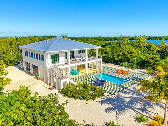 Retreat to over 20 acres of private paradise, where unobstructed open-water views and breathtaking sunrise and sunset skies set the tone for everyday. Remotely tucked away off Old State Road in Sugarloaf Key, this rare beachfront estate delivers a level of privacy and true coastal beauty that is nearly impossible to replicate in the Florida Keys. Concrete construction completed in 2024, this turnkey, fully furnished home was thoughtfully designed to take full advantage of its surroundings. Large hurricane-impact windows and doors frame open-water views from nearly every room, while the bright, spacious interior is completed with stylish, high-end finishes throughout.The outdoor living experience resembles your very own private resort, with multiple spaces designed to take in the peace, quiet, and surrounding views--including the balcony, pool, downstairs covered lanai, and fire pit area. The large, newly completed (2025) saltwater pool features both a heater and chiller for year-round comfort. Artificial turf around the pool creates a clean, low-maintenance outdoor aesthetic ideal for effortless enjoyment. Professionally designed landscaping is supported by a full irrigation system, while mosquito control systems provide coverage across the balcony, pool area, and lower-level seating spaces. Endless adventure begins right in your backyard, with direct access to your own private sandy beach. Launch straight into the Keys' best snorkeling, fishing, diving, kayaking, and exploring. The home is fully wired with CAT6 cabling, features a Sonos sound system throughout the interior and exterior, and includes a 500-gallon propane tank. Rare in scale, intentional in design, and defined by unmatched privacy and open-water views, this is a generational opportunity to own a truly one-of-a-kind beachfront retreat in the Florida Keys.