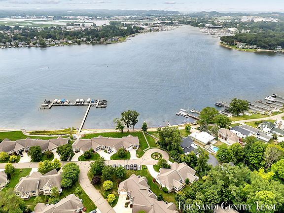 Luxurious lakeside living awaits in this exceptional end-unit Gables By The Lake condominium, offering nearly 3,200sq ft of beautifully finished space with 4 bedrooms, 2.5 baths, and a 28x16 dock (Unit 19) included in the sale. Perfectly situated on the sparkling shores of Spring Lake, this residence combines breathtaking water views, meticulous craftsmanship, and a floor plan designed for both comfort and entertaining. The open-concept main level features a gorgeous kitchen with Cambria countertops, an expansive center island, premium stainless steel appliances, subway tile backsplash, soft-close cabinetry, and Restoration Hardware light fixtures. The dining area and vaulted-ceiling living room showcase shiplap walls, a large deluxe Astria Georgian fireplace (wood or gas burn), and walls of windows framing the lake. Step onto the 220 sq ft Trex deck perfect for morning coffee, summer gatherings, and soaking in endless views with a gas line ready for grilling.